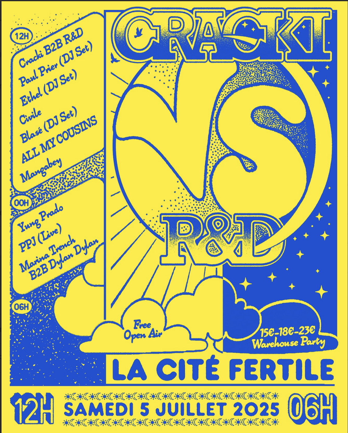 Samedi 5 juillet, Cracki Records et Recherche & Développement avaient uni leurs forces pour un événement XXL inédit à la Cité Fertile ! 14 HEURES DE FÊTE NON-STOP 🥵 De midi à deux heures, le public avait profité d’un open air gratuit et gargantuesque ! Au programme, un line-up mêlant DJ sets et lives, artistes de la maison ou coups de cœur communs, le tout pensé comme une véritable passerelle entre nos deux labels amis !